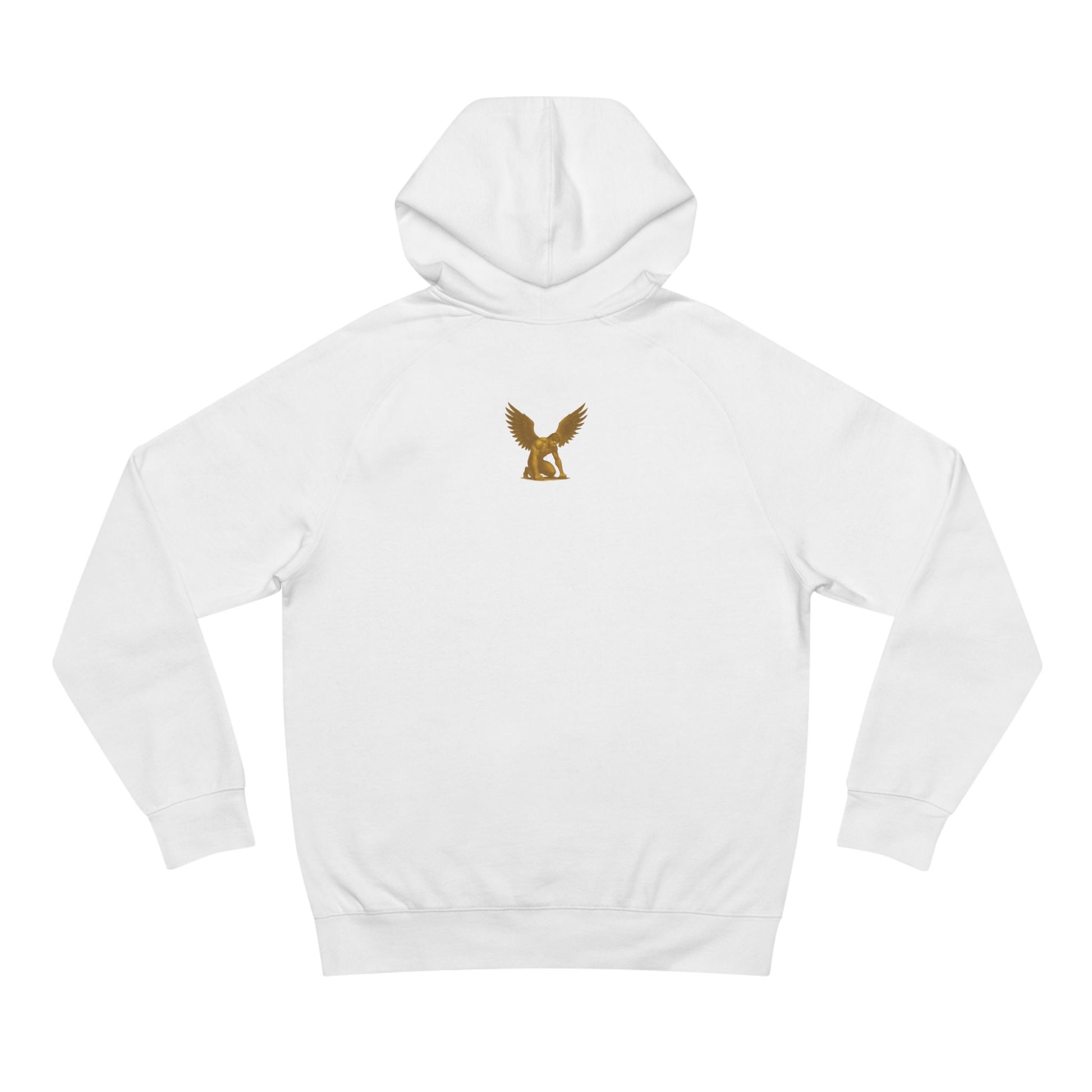 Soft, structured, and quietly bold — this midweight hoodie wears its vintage-inspired emblem like a badge of intent. The front features a refined, old-world script paired with a small winged figure, rendered in warm gold tones that age beautifully against the clean white fleece. It settles into everyday life easily: pull the hood up on windy commutes, slide your hands into the roomy kangaroo pocket between gigs, or layer it under a jacket for late-night walks. The fit is relaxed without being oversized, so it reads thoughtful and wearable rather than loud. It’s for people who prefer understated symbolism and comfort that lasts — wearable art that moves with you through rehearsals, coffee-shop brainstorming, or slow weekend mornings.